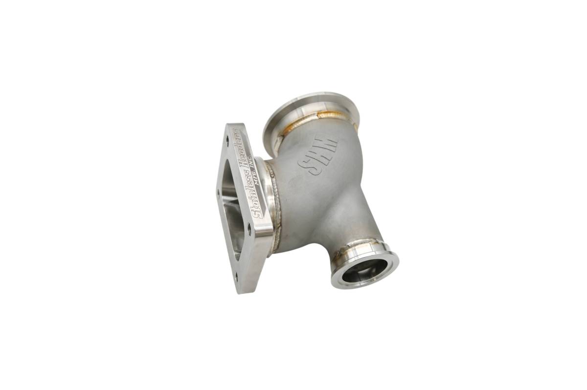 Available as a blank elbow, or with any combination of v-bands, T4 flanges, and wastegate flanges. 3" OD x 2.5" CLR